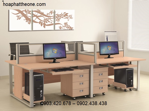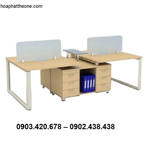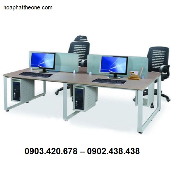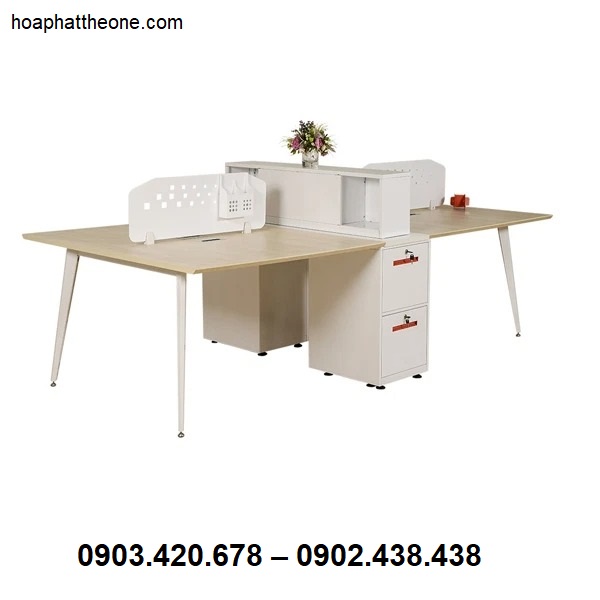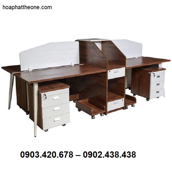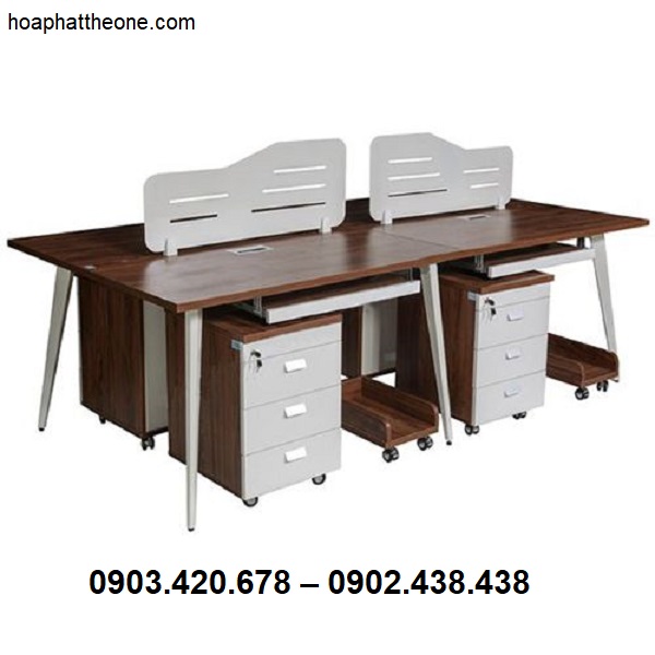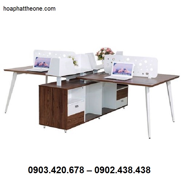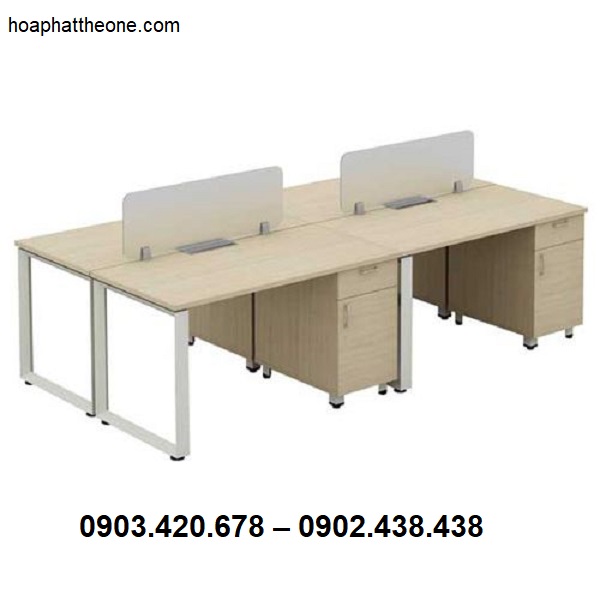 Đây chính là cụm bàn làm việc với thiết kế 4 chỗ, bề mặt hình chữ nhật. Và được phân tích với nhau bằng vách ngăn kính sang trọng, đẹp mắt. Chất liệu của bàn được làm từ gỗ công nghiệp có phủ Melamine tinh tế. Chính chất liệu này sẽ giúp mang lại ưu điểm chống cháy, chống thấm nước, trầy xước. Hơn nữa việc vệ sinh cũng vô cùng dễ dàng, sản phẩm luôn đẹp và mới như lúc mua.