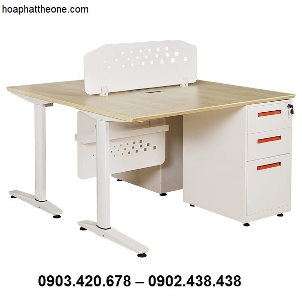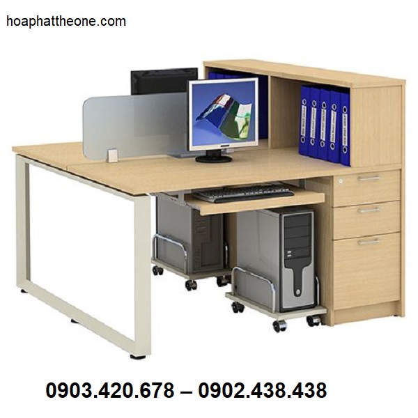 Vách ngăn bàn phân chia bằng sắt chắc chắn. Phần khung bàn được sản xuất từ thép sơn tĩnh điện. Ngoài ra thiết kế của mẫu bàn này còn có khu vực để CPU, bàn phím. Kết hợp với hộc liền 2 ngăn kéo tiện lợi trong việc cất giữ giấy tờ và tài liệu.
