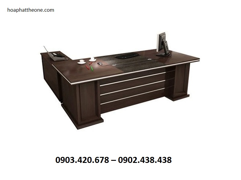 Phần yếm bàn giật cấp phẳng, trang trí bởi các đường nẹp nhôm chạy ngang rất đẹp. Mặc dù đơn giản nhưng vẫn mang lại điểm nhấn tối ưu cho sản phẩm. Chất liệu của bàn giám đốc là gỗ công nghiệp phủ Melamine cao cấp. Do vậy mang đến sự bền bỉ theo thời gian, an tâm khi sử dụng.