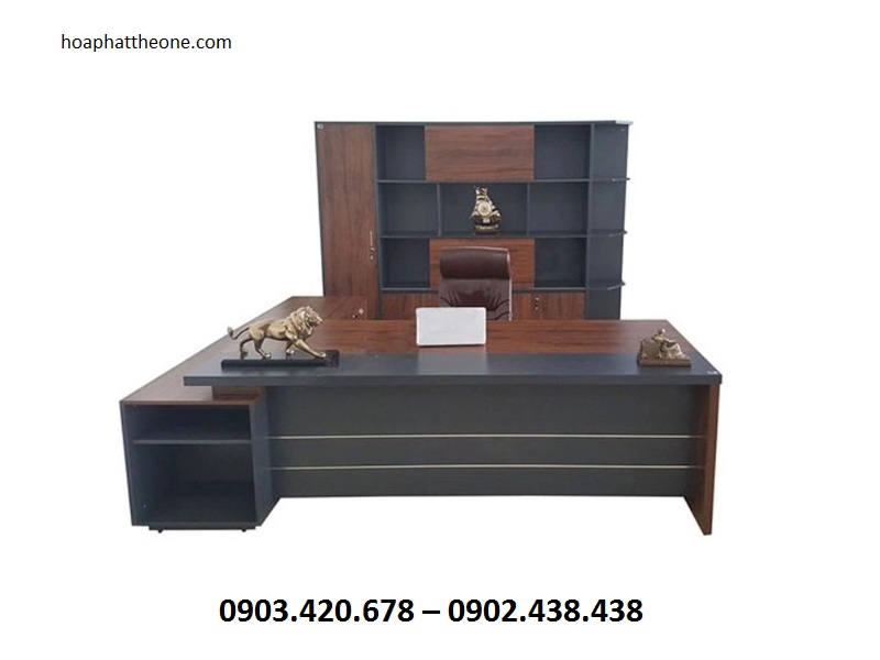 Đây là mẫu bàn ghế giám đốc cao cấp được thiết kế với vẻ đẹp sang trọng và lịch lãm. Màu sắc vân gỗ nâu trầm kết hợp cùng xám đen càng tạo sự uy quyền. Kích thước của bàn làm việc là W2700 x D2005 x H760mm. Đây cũng chính là kích thước tiêu chuẩn được đánh giá coa từ khách hàng.