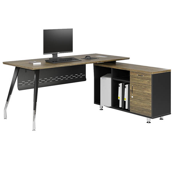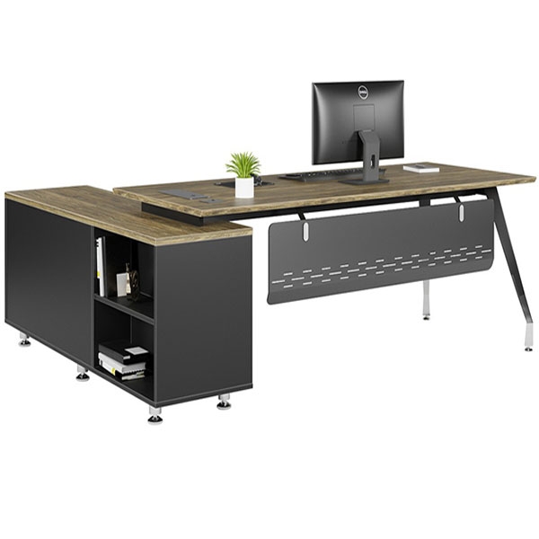 Kiểu Dáng Mặt bàn hình chữ nhật, 2 cạnh dài vát 45 độ, có 1 ổ cắm trượt và nắp đi dây vuông màu đen. Bàn giám đốc có tủ phụ bên tay phải người ngồi.