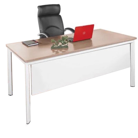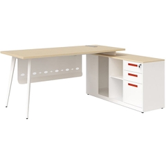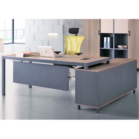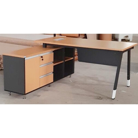 Chất liệu: Mặt bàn và nóc tủ phụ gỗ Melamine. Chân thép tấm gấp, yếm tôn sơn tĩnh điện. Tủ phụ tiêu chuẩn bên tay phải người ngồi
