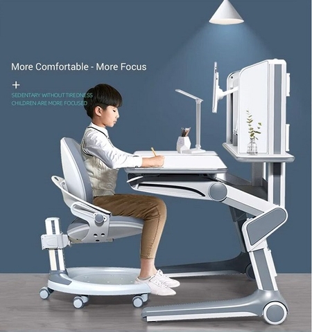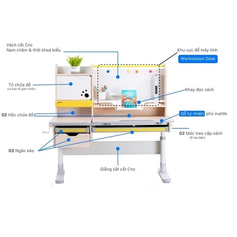 Đặc trưng Bàn học sinh thông minh chống gù chống cận, có khả năng nâng hạ chiều cao bằng nút thủy lực. Mặt bàn có độ nghiêng từ 0-45 độ. Giá sách lớn đi kèm + kệ đỡ sách nhỏ. Điều chỉnh nâng hạ bằng Thuỷ lực một chạm