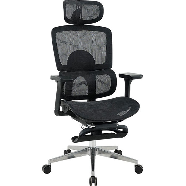 Chất liệu: Khung tựa nhựa bọc vải lưới. Đệm điều chỉnh chiều sâu. Tay ốp PU mềm. Chân hợp kim nhôm