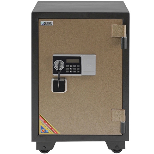 Kiểu Dáng Két đứng có khoá chìa, khoá điện tử, tay nắm vuông, bên trong có ngăn phụ và 1 đợt di động. Bánh xe sắt di chuyển