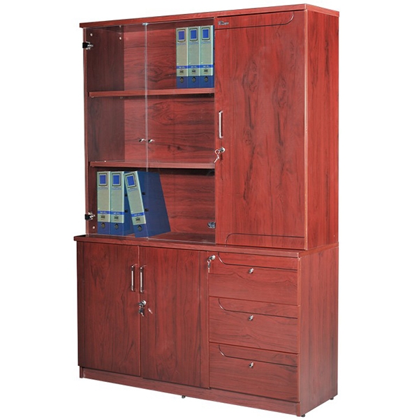 Kiểu Dáng Tủ tài liệu 3 buồng, phía trên gồm 2 khoang cánh kính để tài liệu và 1 khoang treo áo, phía dưới có 3 ngăn kéo và hai cánh mở.