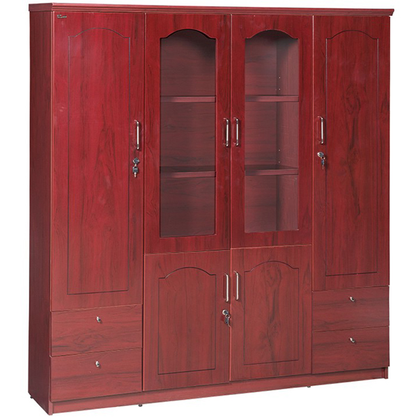 Kiểu Dáng Tủ tài liệu 4 buồng, phía trên gồm 2 khoang cánh kính để tài liệu và 2 khoang treo áo, phía dưới có 4 ngăn kéo và hai cánh mở.