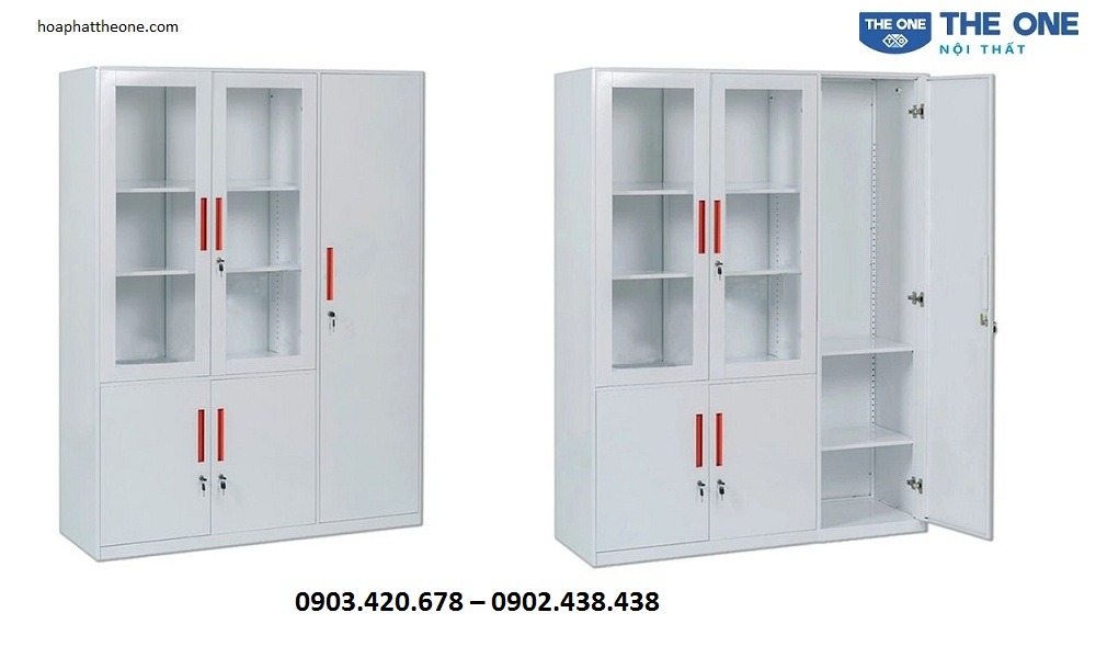 Tủ văn phòng sắt sơn tĩnh điện TU09K5D có công năng chính là lưu trữ hồ sơ, tài liệu, giấy tờ, đồ dùng văn phòng, đồ dùng cá nhân. Tủ có các khoang đợt chuyên dụng lưu trữ tài liệu và khoang treo quần áo dáng dài. Sản phẩm bao gồm khoang cánh kính và cánh sắt, phù hợp với nhu cầu lưu trữ khác nhau. Cánh tủ có tai chìa khóa, tay nắm âm màu cam, tăng tính năng bảo mật và tiện ích khi sử dụng. Sản phẩm được ứng dụng tại phòng làm việc cá nhân hoặc phòng làm việc chung, công sở, đơn vị hành chính.