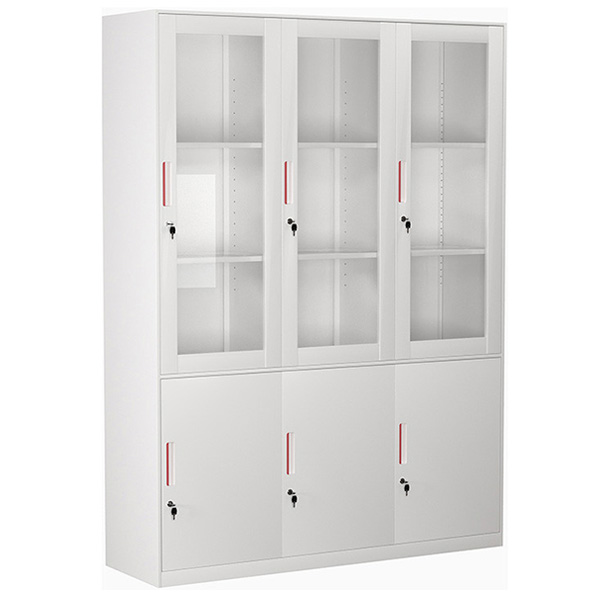 Tủ hồ sơ sắt sơn tĩnh điện TU09K7D, được thiết kế với kiểu dáng hiện đại, mang đến nhiều tiện ích cho người dùng. Tủ có thiết kế 2 buồng với công năng chính là lưu trữ hồ sơ, tài liệu, giấy tờ. Buồng bên trên được chia thành 3 khoang cánh kính mở, lòng khoang có 2 đợt chia thành 3 tầng để tài liệu. Buồng bên dưới có 3 khoang nhỏ cánh sắt mở. Cánh tủ có tai khóa riêng, tay nắm âm màu cam nổi bật.
