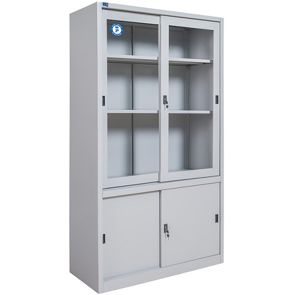 Kiểu Dáng Tủ sắt để hồ sơ. Khoang trên 2 cánh kính lùa, trong có 2 đợt cố định. Khoang dưới 2 cánh sắt lùa