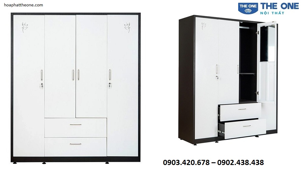 Ở ngoài sẽ được thiết kế thêm 2 ngăn kéo và ở mỗi khoang có thêm 1 đợt đi động kèm theo 1 suốt để treo quần áo. Đặc biệt hơn cả là ở khoang cánh mở ngoài cùng có thêm 1 ngăn để đồ được bảo mật chắc chắn như mã của két sắt. Tủ thiết kế phần cánh giữa có thêm 1 tấm gương, đây sẽ là tiện ích hữu ích khi bạn cần soi lại những bộ quần áo khi mặc trên người. Với gương bạn có thể ngắm mình xem đã mix đồ chuẩn chưa khi chuẩn bị lên đồ để dự sự kiện nào đó.