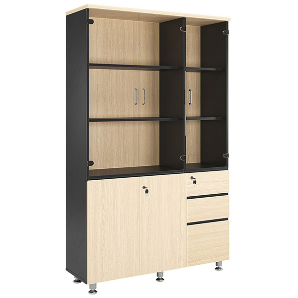 Đặc trưng Tủ đứng 3 buồng. Phía trên có 3 cánh kính, đợt di động. Phía dưới 2 khoang cánh mở và 3 ngăn kéo. Tay nắm vát cạnh.