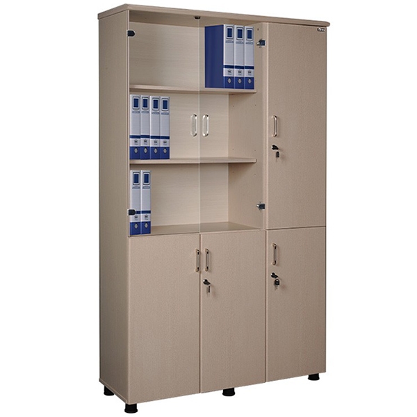 - Kiểu dáng: Tủ tài liệu văn phòng dáng đứng gỗ công nghiệp. Tủ có 3 buồng. Phía trên được chia thành 2 khoang cánh kính 3 ngăn được dùng lưu trữ tài liệu; Và 1 khoang cánh gỗ mở có suốt treo quần áo. Phía dưới bao gồm 1 khoang 2 cánh gỗ mở và 1 khoang 1 cánh gỗ mở.