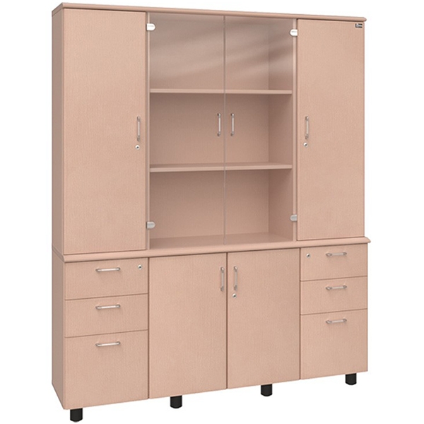 Kiểu dáng Tủ tài liệu 4 buồng NT1960-4BN. Phần trên có khoang giữa 2 cánh kính, 2 bên là cánh dài. Phần dưới khoang giữa là 2 cánh mở, 2 bên là hộc 4 ngăn kéo.